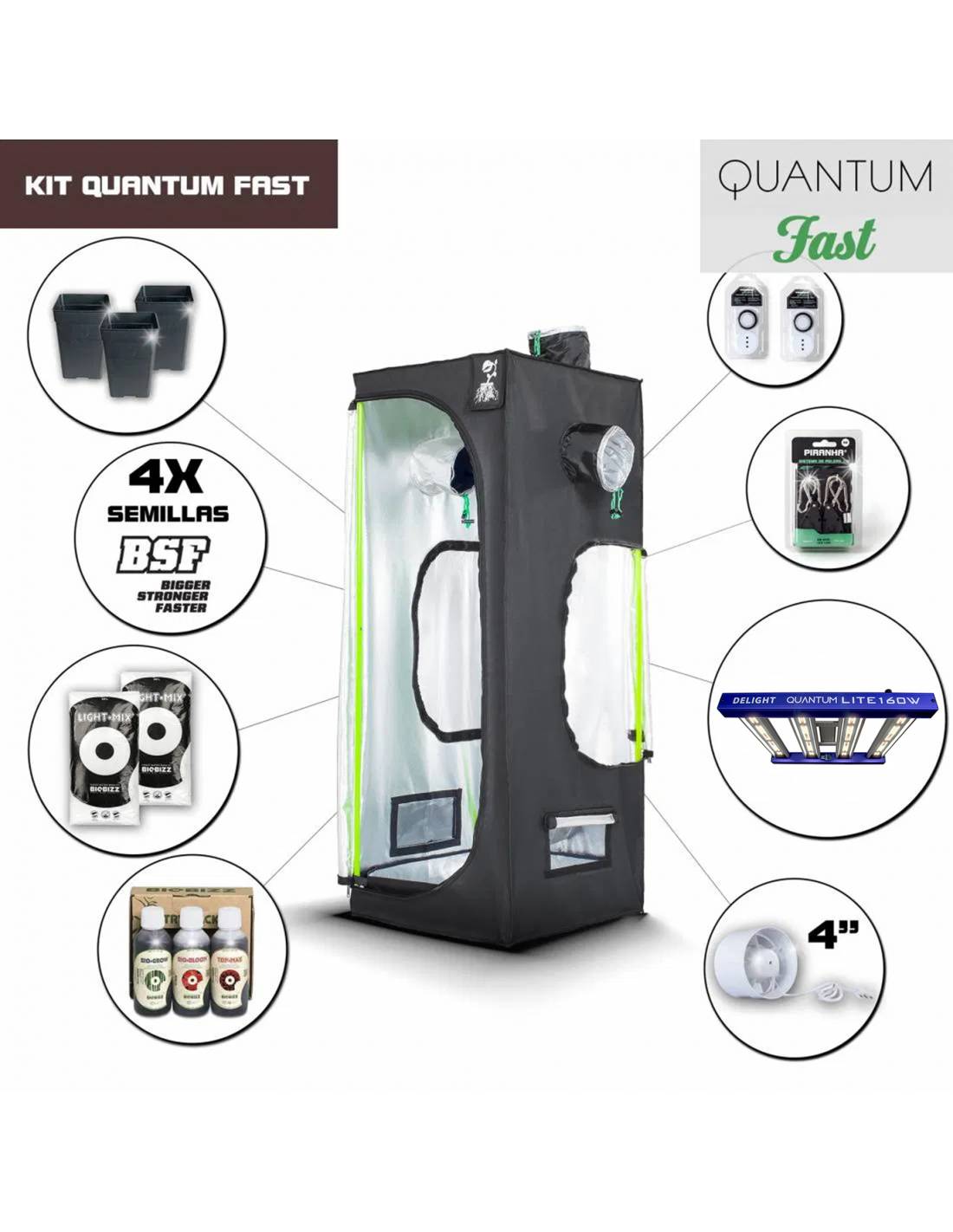 KIT PIRANHA QUANTUM FAST 60 – Q120W MEDIO es la unión entre equipos PIRANHA y las renombradas semillas autoflorecientes BSF. La manera más sofisticada, eficiente y confiable para acceder a un sistema de cultivo plenamente funcional y seguro. Incluye todo el equipamiento para un verdadero indoor: