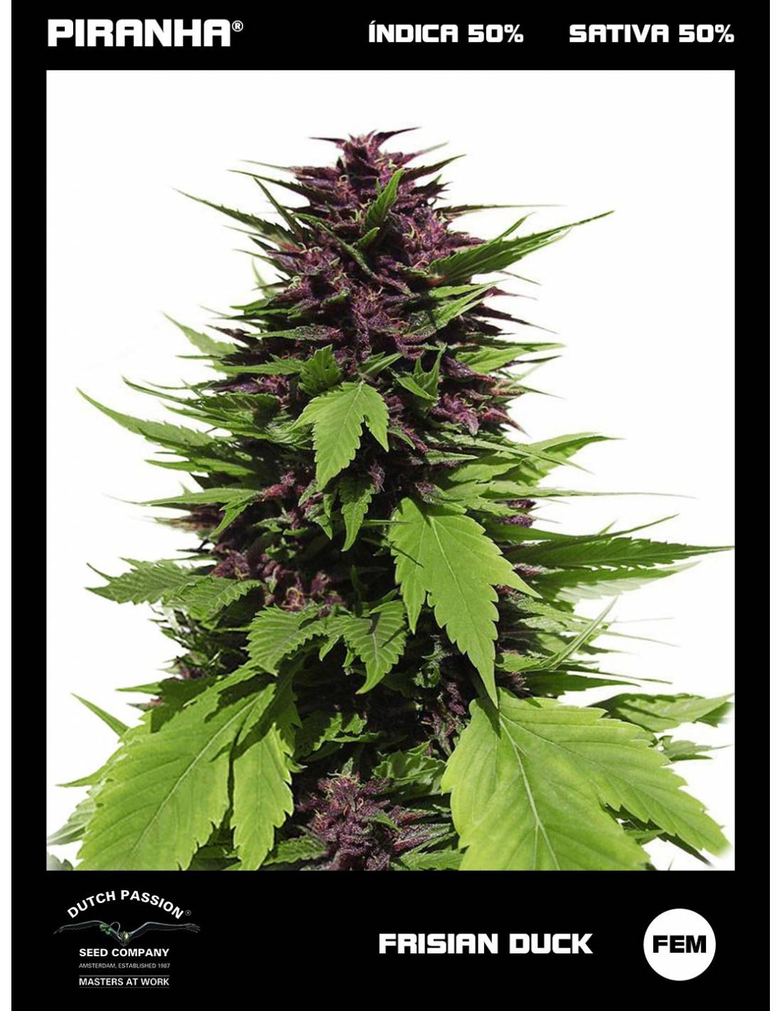 La Frisian Duck, con una forma inusual en sus hojas que dificultan su identificación como cannabis tradicional, es ideal para el cultivo exterior y en invernadero en zonas pobladas. Su nombre hace referencia a la forma distintiva de la hoja, parecida a una huella de pato especialmente durante las dos primeras partes de su vida. Durante la floración, algunas hojas de la parte superior pueden mostrar la forma del cannabis más tradicional.