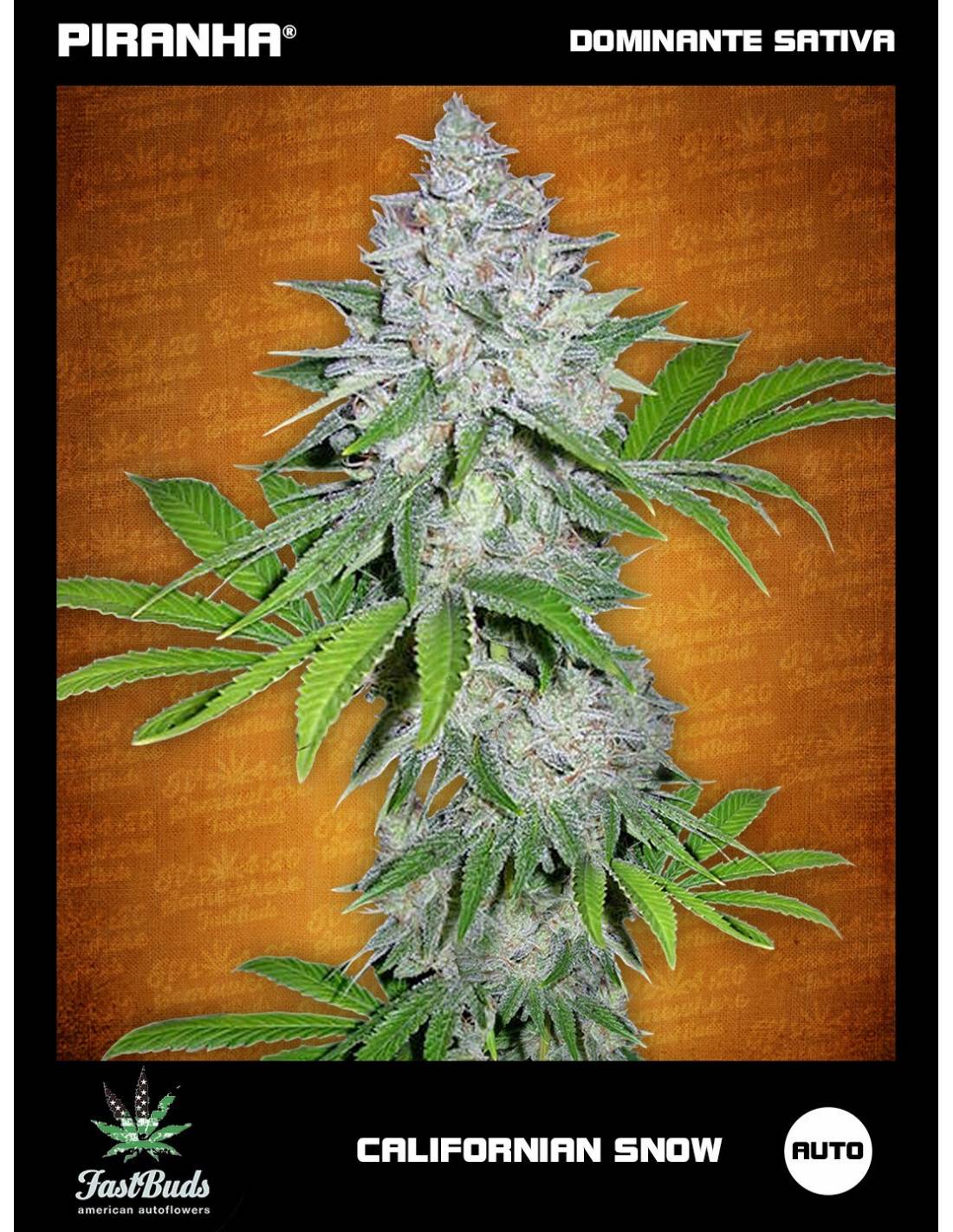 La Californian Snow es la variedad más rara y atrevida creada por el equipo de biólogos de FastBuds. Californian Snow es un cruce entre un fenotipo Americano de la vieja escuela Hot California, con una cepa de Ruderalis Canadiense que se ha descubierto a finales del 2013. Es estable y muy resolutiva. Presenta mayor porcentaje de Sativa, aunque también guarda características de Indica, y por supuesto de Ruderalis que le asegura el gen de la autofloración. La planta madura, literalmente, se llena de nieve en su momento de esplendor. Se ha llamado así porque los cogollos están tan cubiertos de resina que parece que estén nevados. ¡Su aspecto es increíble!