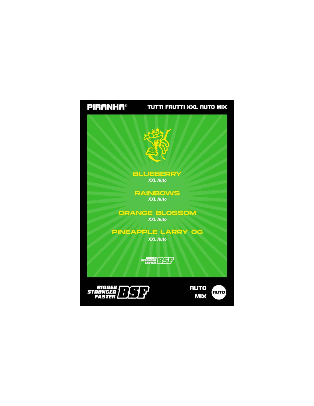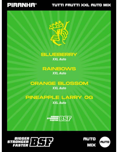 BSF Seeds presenta un nuevo mix autofloreciente. Tutti Frutti XXL Auto Mix es una explosión de sabor de 4 de las variedades más frutales de BSF Seeds en su versión automática; Auto Blueberry, Auto Rainbows, Auto Orange Blossom y Auto Pineapple Larry OG. Una increíble mezcla de terpenos separados en burbujas independientes.