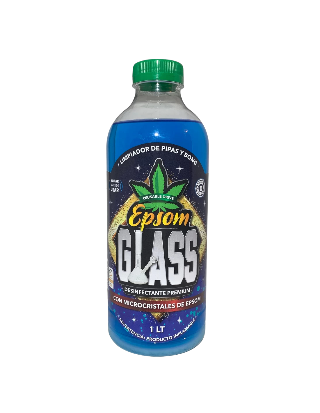 Desinfectante premium con microcristales de Epsom, limpiador de Pipas o Bong de Pyrex, Borosilicato, Cerámicos, Silicona y Artefactos Metálicos. Mata el 99,9% de virus y bacterias, es reutilizable, es decir, que después de lavar un artefacto, el producto puede ser almacenado en otro envase o frasco con tapa para volver a utilizar.