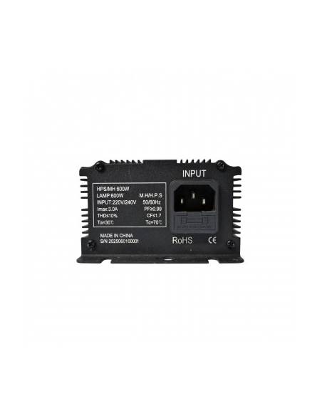 Se integra fácilmente a reflectores con portalámparas E40 y temporizadores de 220–240V, entregando encendido controlado para proteger la lámpara y reducir picos de corriente. Su electrónica minimiza vibraciones y ruido eléctrico respecto de balastros magnéticos, ayudando a mantener fotoperiodos consistentes en crecimiento y floración. Es una base ideal para armar kits de 600W o potencias menores (400W y 250W). La performance final dependerá del diseño del cuarto, ventilación y calidad de red.