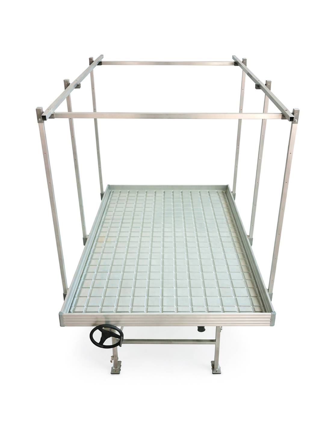 Su estructura combina patas y bandejas de acero galvanizado, entregando alta firmeza y excelente resistencia a la corrosión en ambientes húmedos. La mesa se desplaza sobre rieles de aluminio grado marino, permitiendo un movimiento lateral suave y preciso que mejora el acceso a las plantas sin necesidad de dejar pasillos fijos. Las repisas son regulables en altura, lo que permite ajustar la distancia entre plantas y luminarias según la etapa del cultivo. En la base incorpora una bandeja preparada para sistema ebb & flow, lista para integrar riego por inundación y drenaje de forma eficiente.