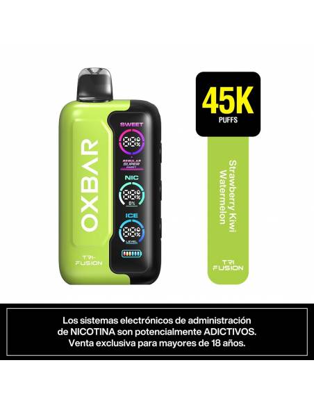 El Oxbar Tri Fusion 45K Puffs Strawberry Kiwi Watermelon es un vaporizador desechable con sistema Triple Tank Control, diseñado para ofrecer un nivel de personalización superior directamente desde el dispositivo. Permite ajustar de forma independiente la nicotina, la intensidad de sabor y el efecto ice, facilitando cambios rápidos entre caladas sin necesidad de cambiar de equipo.
