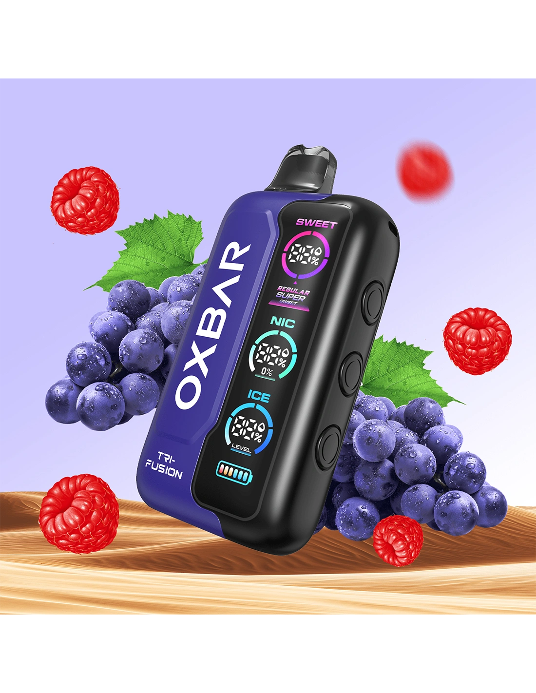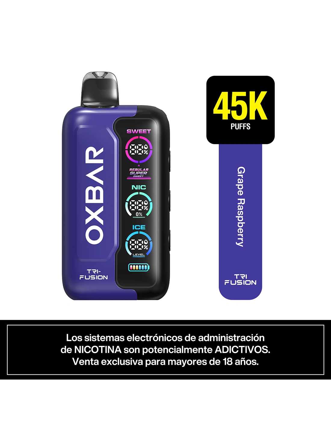 El Oxbar Tri Fusion 45K Puffs Grape Raspberry es un vaporizador desechable equipado con sistema Triple Tank Control, diseñado para ofrecer personalización directa en cada calada. Permite ajustar de forma independiente los niveles de nicotina, la intensidad de sabor y el efecto ice, facilitando cambios en la experiencia sin necesidad de cambiar de dispositivo.