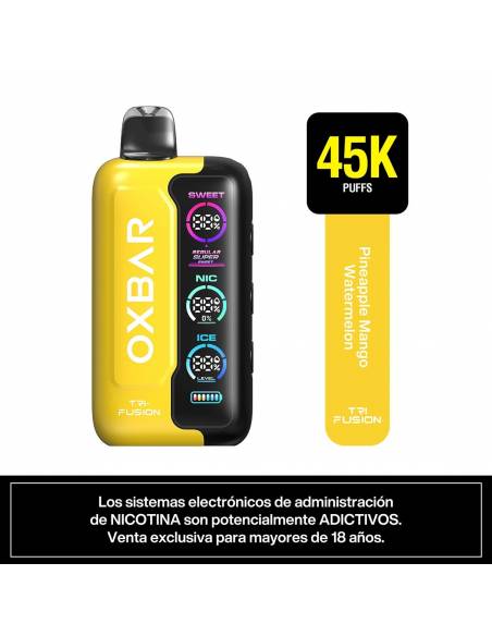 El Oxbar Tri Fusion 45K Puffs Pineapple Mango Watermelon es un vaporizador desechable equipado con sistema Triple Tank Control, diseñado para ofrecer personalización directa en cada calada. Permite ajustar de forma independiente los niveles de nicotina, la intensidad de sabor y el efecto ice, modificando la experiencia según tu preferencia sin necesidad de cambiar de dispositivo.