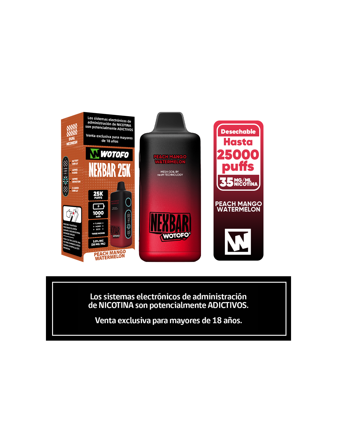 El NEXBAR 25K Peach Mango Watermelon es un vaporizador desechable recargable con un perfil frutal intensamente tropical que combina la suavidad del durazno, la dulzura exótica del mango y la frescura jugosa de la sandía. Esta mezcla crea una experiencia equilibrada, dulce y refrescante, diseñada para vapeo prolongado con sabor constante desde la primera hasta la última calada, con una autonomía estimada de hasta 25.000 puffs.